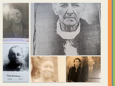 Center photo: Elizabeth (Betty) Hadley; Upper left: Mary Walden (daughter od Elizabeth and her 3rd husband Jerry Walden Sr.; Lower left: Pleas Hawthorne (son of Elizabeth and her 1st husband William P. Hawthorne); Bottom center: Erma Bullock (daughter of George Bullock and Hattie Dickey, making Erma the great grandaughter of Elizabeth and her 2nd husband William Dickey; Bottom right: Emma Hadley-Lewis & family (Emma is the daughter of Mary Walden -shown on upper left- and her husband Harkless Hadley: Emma is therefore, the granddaughter of Elizabeth and her 3rd hudband Jerry Walden Sr.)